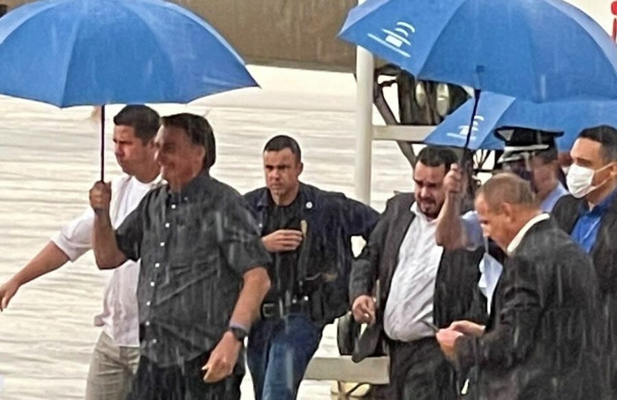 O avião com a comitiva presidencial pousou às 15h10. No desembarque, Bolsonaro estava sem máscara ao cumprimentar autoridades e apoiadores.