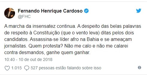 O ex-presidente Fernando Henrique Cardoso já declarou que não vai apoiar Fernando Haddad no segundo turno, já qualificou a campanha atual como “marcha da insensatez” e, nesta quarta, 10, escreveu que “assassina-se líder afro na Bahia e se ameaçam jornalistas. Não me calo e não me calarei contra desmandos, ganhe quem ganhar”. FHC está no radar da campanha petista para somar forças contra o adversário Jair Bolsonaro.
