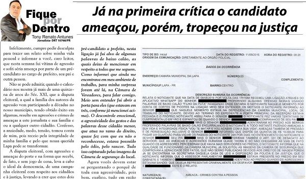 O jornalista Tony Renato Antunes denunciou esta semana ter sido vítima de agressão e ameaças a sua família, realizadas pelo pré-candidato a prefeito da Lapa, Marcelo Batista (PSDB). O caso ocorreu dentro da Câmara de Vereadores do município, na região metropolitana de Curitiba. Marcelo estava estava acompanhado do pai, o ex-prefeito Miguel Batista e uma terceira pessoa.