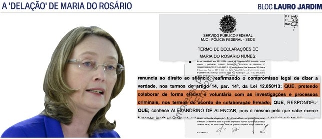 Maria do Rosário depôs há algumas semanas na Polícia Federal sobre a suspeita de recebimento de caixa dois, a partir da delação da Odebrecht. Como já fizera antes, negou que tenha recebido dinheiro da construtora. Beleza. Lá pelas tantas, antes de relatar as respostas da deputada aos questionamentos, anotou o escrivão da PF, sobre Maria do Rosário: “… que pretende colaborar de forma efetiva e voluntária com as investigações e processos criminais, nos termos do acordo de colaboração firmado”. A petista, no entanto, não firmou qualquer acordo de colaboração. As informações são de Guilherme Amado n’O Globo.
