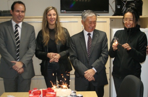 O líder do PMDB na Assembleia Legislativa, Teruo Kato, completa idade nova nesta quarta-feira (12). Teruo foi surpreendido, logo pela manhã, com uma recepção calorosa dos colaboradores, organizada pela esposa, Jeanne (na foto, à direita).
