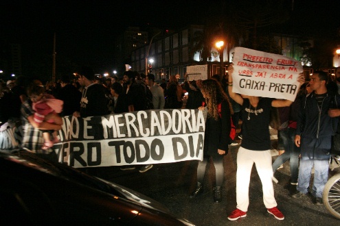 De lá, eles partiram em passeata pelas ruas centrais de Curitiba até em frente à Prefeitura, onde o inquilino é Fruet. Nos cartazes, além de pedir a redução da tarifa do transporte coletivo, os manifestantes pediam para o prefeito abrir a caixa-preta da URBS, que guarda a famosa planilha da “tarifa técnica”.