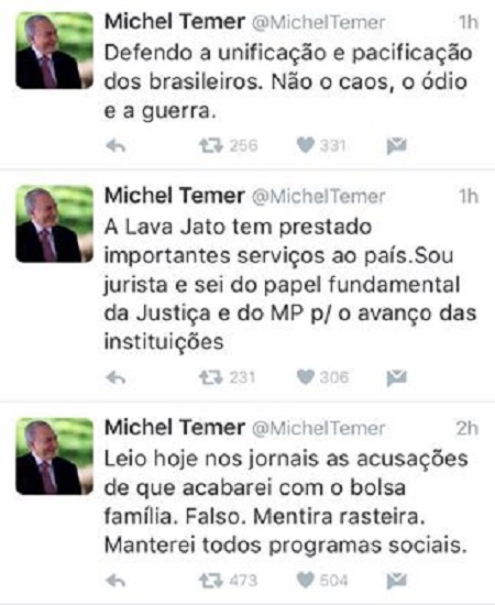 Do vice-presidente Michel Temer (PMDB), em seu perfil no Twitter, rebatendo as declarações da presidente Dilma (PT), em vídeo publicado na noite de sexta-feira (15) nas redes sociais. O impedimento ou não de Dilma será decidido neste domingo (17), a partir das 14h na Câmara dos Deputados.