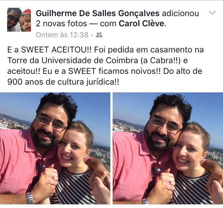 O advogado de campanhas da senadora Gleisi Hoffmann (PT-PR), Guilherme Gonçalves, que teve a prisão decretada nesta quinta-feira, 23, pela Operação Custo Brasil, está em Portugal por um motivo bem particular: pediu em casamento sua namorada, Carol Clève, na Torre da Universidade de Coimbra. O pedido foi feito nesta quarta-feira, 22, um dia antes da deflagração da operação da Polícia Federal.
