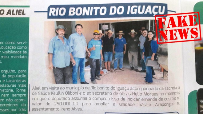 Um jornal de campanha do candidato à Deputado Federal Aliel Machado (PSB) que está sendo distribuído na região sul do Estado, traz nota sobre um valor investido de R$ 250.000,00 (duzentos e cinquenta mil reais) que teria sido viabilizado pelo parlamentar para “ampliar a unidade básica (de saúde) Arapongas no assentamento Ireno Alves do Santos”, zona rural de Rio Bonito do Iguaçu (370 km de Curitiba).