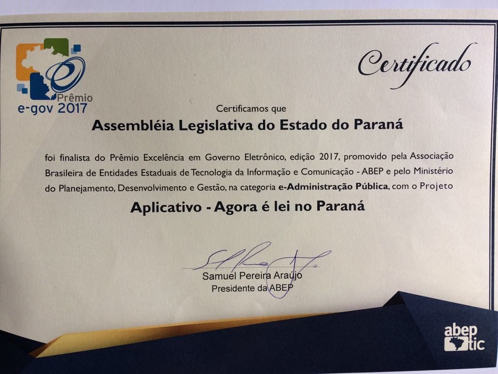 O aplicativo “Agora é Lei no Paraná”, criado pela Assembleia Legislativa do Paraná, recebeu ontem (13) menção honrosa no ‘Prêmio e-Gov’, do Ministério do Planejamento e da Associação Brasileira de Entidades de Tecnologia da Informação e Comunicação – Abep. É o mais importante reconhecimento do país a projetos e soluções de governo eletrônico e foi entregue em uma cerimônia em Pernambuco. O “Agora é Lei” disputou com 88 concorrentes do Brasil inteiro, ficou entre os 12 finalistas e foi o único dispositivo desenvolvido por um Legislativo estadual. O primeiro lugar foi dado a um aplicativo do governo do Piauí, “MobiEduca.ME-Combate à Evasão Escolar”.