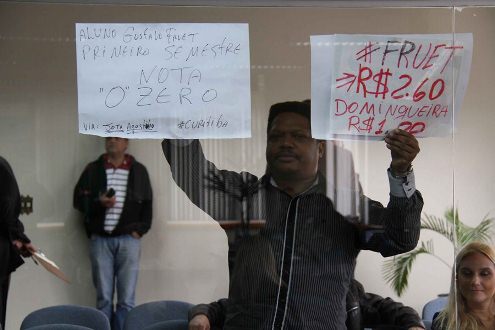 Jeitoso, como mostra a foto, levou para o local cartazes afirmando que o prefeito Gustavo Fruet (PDT), como aluno, tirou nota zero até agora. Em outra peça, o bruxo pede para o prefeito voltar ao valor da passagem de ônibus para R$ 2,60 e a domingueira a R$ 1,00.