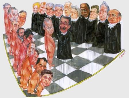 Abre quinta-feira, o inédito julgamento de 38 réus de uma só vez, pelo Supremo Tribunal Federal, no caso que ficou conhecido como Mensalão, aqui em notável charge de Chico Caruso. A TV Justiça vai rivalizar narrando tudo, ou quase tudo, com os eventos das Olimpíadas de Londres e com as notícias do período eleitoral, e dividir holofotes sobre o Mensalão com a grande imprensa. Os réus, petistas ilustres, vão estar no julgamento, que expõe a todo o país os podres do partido.