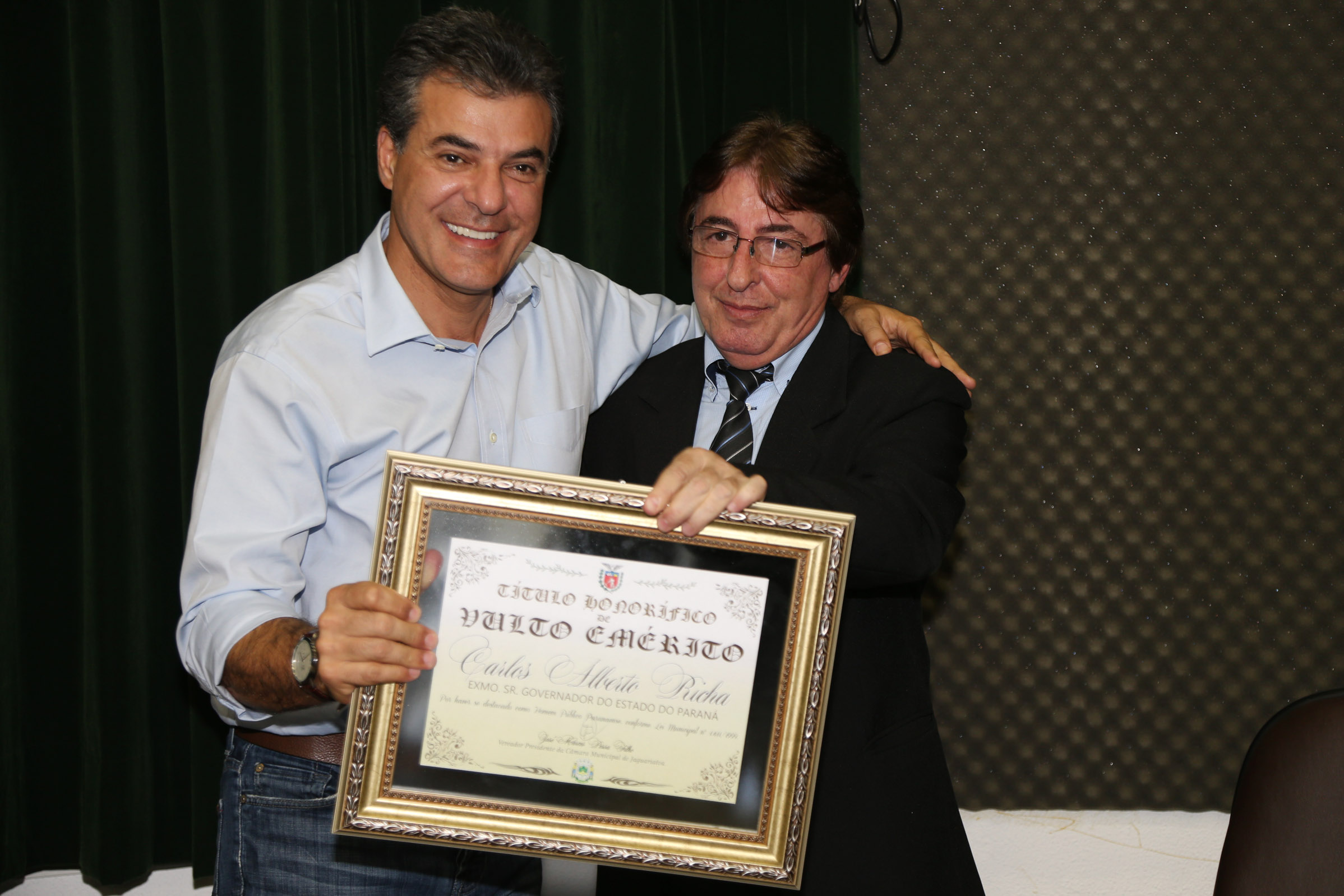 O governador Beto Richa recebeu o Título Honorífico de Vulto Emérito, concedido nesta quarta-feiura (6) pela Câmara de Vereadores de Jaguariaíva, em sessão solene comandada pelo presidente da Casa e também autor do projeto de lei, José Marcos Pessa Filho, acompanhada por deputados e vereadores.