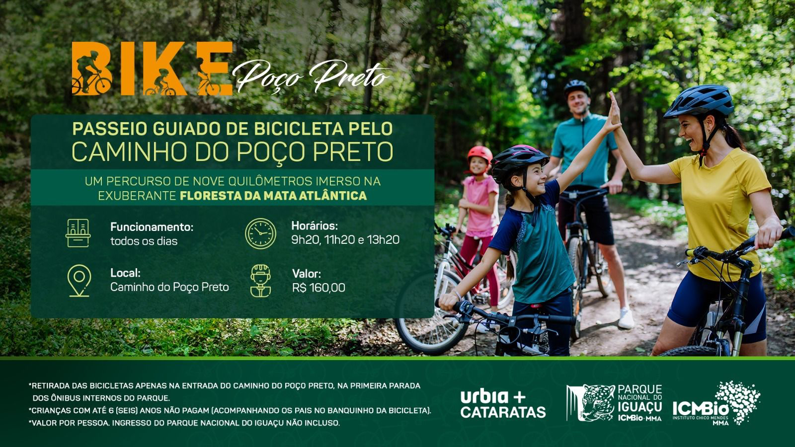 O Caminho do Poço Preto tem trajeto de nove quilômetros, completamente imerso na floresta da Mata Atlântica, proporcionando um ambiente perfeito para atividades de interpretação ambiental e conexão com a biodiversidade do Parque Nacional do Iguaçu. Os passeios guiados de bicicleta serão realizados todos os dias, em três horários: 9h20, 11h20 e 13h20.