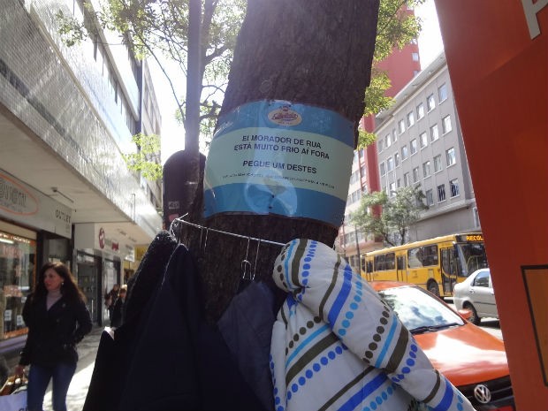 As baixas temperaturas registradas em Curitiba fizeram com que muitos curitibanos se sensibilizassem em ajudar a quem precisa. Uma rede de brechós apostou em uma ideia inusitada para ajudar os moradores de rua e decidiu oferecer as peças penduradas em árvores, dispostas em vários pontos da cidade nesta quarta-feira (24), que amanheceu com mínima de 2ºC negativos, segundo o Insitituto Tecnológico Simepar.