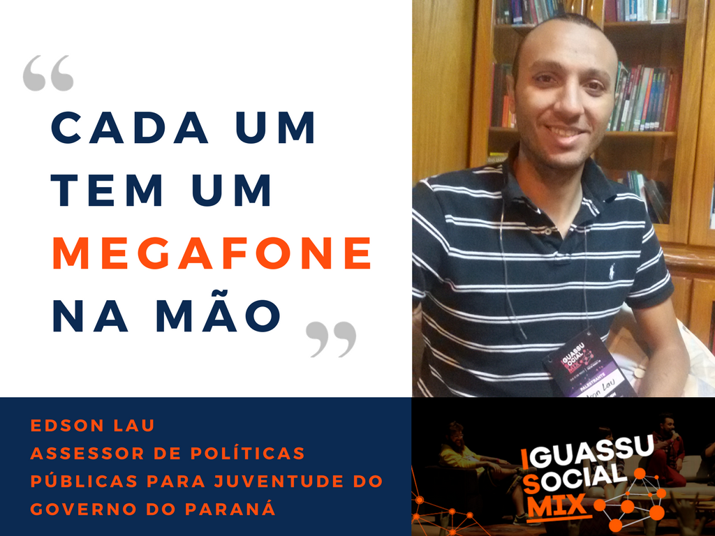 paraná divulga (7)Em entrevista concedida no Iguassu Social Mix (ISM) neste sábado, 13, em Foz do Iguaçu, o assessor de Políticas Públicas para Juventude do Governo do Paraná, Edson Lau Filho, destacou o poder e a influência das pessoas na internet para a definição das políticas públicas e os projetos em benefício da sociedade. “As redes sociais possibilitam, em cada uma das suas plataformas, que cada pessoa tenha um megafone na mão”, disse Lau.“A gente precisa prestar a atenção o que cada uma dessas pessoas está dizendo nesses megafones, pois eles são reproduzidos em rede e essa rede pode dizer algo muito importante para os governantes”, destacou ainda o assessor do Governo do Paraná.
