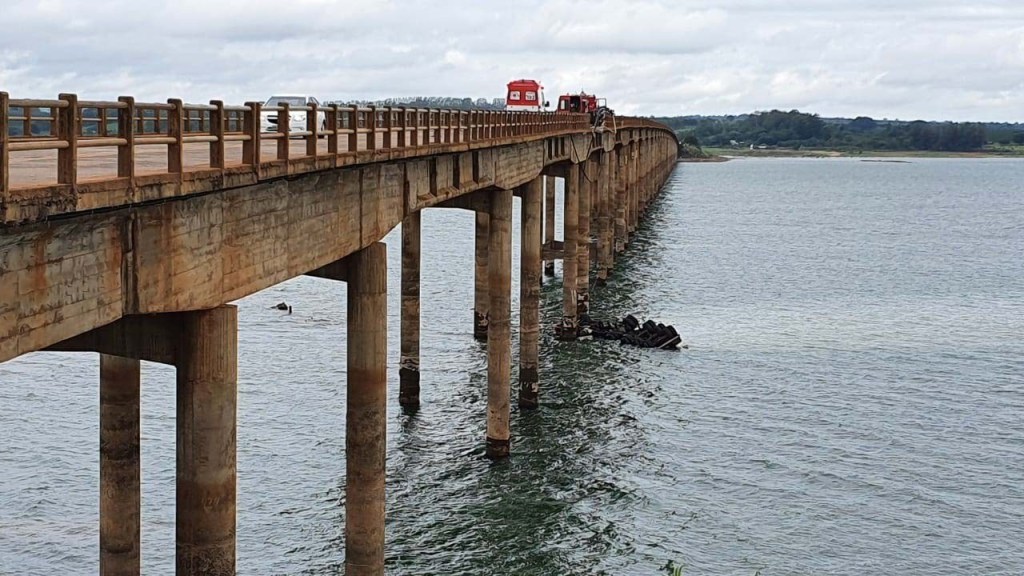 Um caminhão despencou na manhã desta quarta-feira, 13, no lado paulista da ponte Prefeito Benedito Garcia Ribeiro, que faz a divisa dos estados do Paraná e São Paulo, na rodovia Jayme Canet (PR-218) entre os municípios de Carlópolis e Fartura.
