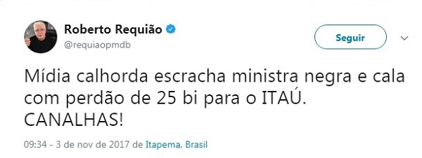 Requião, que acumula salário de senador e aposentadoria de governador do Paraná, recebendo cerca de R$ 60 mil do cofres públicos, vai à loucura. Instiga a imprensa a falar sobre o perdão da dívida de R$ 25 bilhões que o governo de Michel Temer deu ao banco Itaú e procura salvar o pelo da colega Luislinda. “Mídia calhorda escracha ministra negra e cala com perdão de 25 bi para o Itaú. Canalhas!”, esbraveja o peemedebista