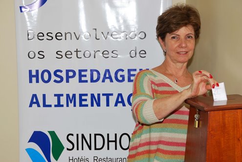 Na foto, a empresária Emília Mendes, no momento do voto na eleição do Sindihotéis