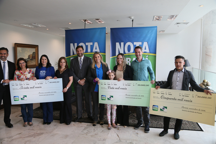 A governadora Cida Borghetti entregou nesta terça-feira (27), no Palácio Iguaçu, os principais prêmios do 36º sorteio do Programa Nota Paraná, coordenado pela Secretaria de Estado da Fazenda. Um vendedor de Ponta Grossa, uma instituição de assistência social de Curitiba e uma professora, também da Capital, foram os vencedores dos prêmios de R$ 50 mil, R$ 30 mil e R$ 20 mil.