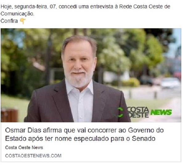 O ex-senador Osmar Dias, do PDT, continua sua cruzada de negar dia sim, outro também, que não vai disputar uma cadeira no Senado, numa chapa tendo Ratinho Junior (PSD) ao Governo do Estado. Ontem (07), sua assessoria se apressou em postar nas redes sociais, uma peça com foto de Osmar citando entrevista à Rede Costa Oeste de Comunicação, seguida da chamada “Osmar Dias afirma que vai concorrer ao Governo do Estado após ter nome especulado para o Senado”. Só para constar, o boato surgiu na última semana, com repercussão na revista Veja.