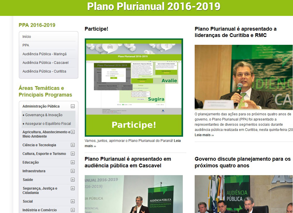 Termina nesta segunda (31) a audiência pública virtual do Plano Plurianual 2016-2019 – o planejamento das ações do Governo do Estado para os próximos quatro anos. Para garantir a participação da sociedade na elaboração do plano, o Governo criou a páginawww.governoecidadao.pr.gov.br. No site é possível enviar dúvidas, sugestões e também avaliar as iniciativas que já estão na proposta apresentada pela Secretaria do Planejamento e Coordenação Geral.