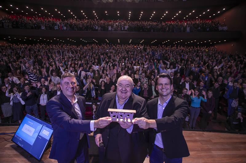 Com o teatro cheio de quem faz o Vale do Pinhão, o prefeito Rafael Greca, ao lado do vice-prefeito e secretário estadual das Cidades, Eduardo Pimentel, e do presidente da Agência Curitiba de Desenvolvimento e Inovação, Dario Paixão, apresentou à plateia o troféu recebido por Curitiba no dia 8 de novembro, em Barcelona (Espanha). A capital conquistou o título do World Smart City Awards 2023, na categoria “Cidades”.