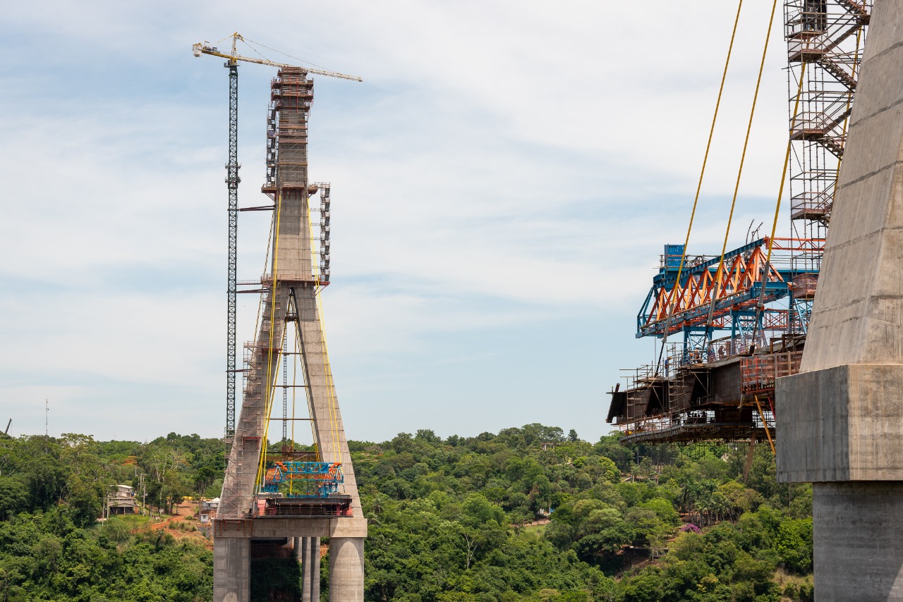 Os dois mastros principais, que têm formato de “Y” invertido, são as maiores estruturas de sustentação da Ponte da Integração, compostas também por apoios intermediários. A conclusão desta etapa marca o fim da fase de concretagem de grandes volumes da obra. No total, serão usados na construção 38 mil metros cúbico de concreto.
