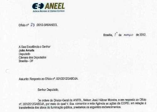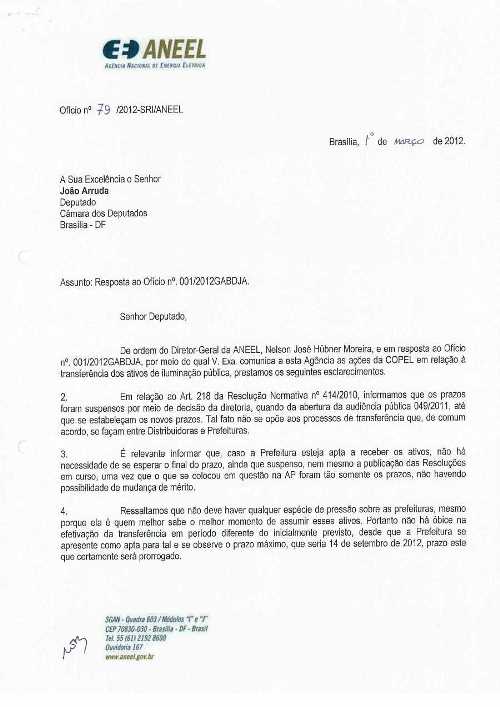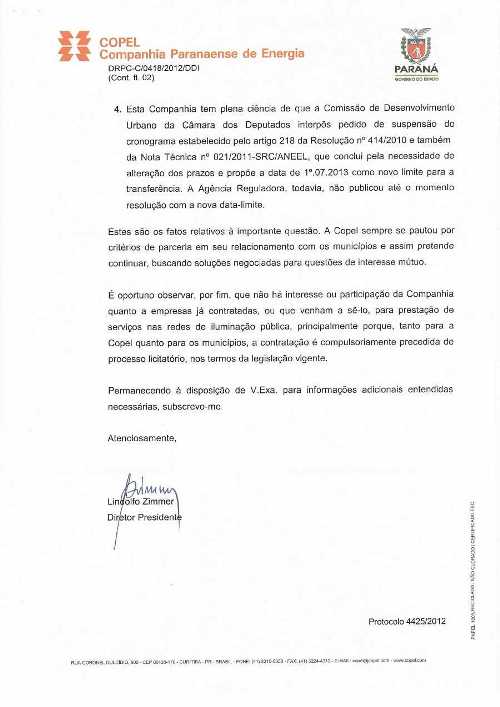 No ofício enviado pela Copel, o presidente Lindolfo Zimmer, relata que a empresa ainda não foi comunicada sobre o novo prazo. “Só que o ofício da Aneel deixou isto bem claro, portanto, a Copel não está agindo como uma empresa municipalista, ela está agindo de má fé mesmo”, disse concluiu João Arruda.