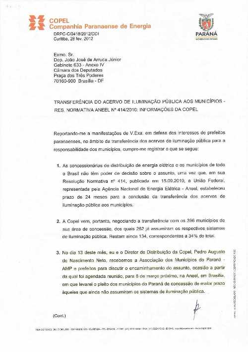 João Arruda destaca que a Aneel transferiu, para 1º de julho de 2013, a entrada em vigor do artigo 218 da referida resolução. “É exatamente isto que a Copel disse que vai defender na Aneel, a mudança nos prazos que já foi definido”.