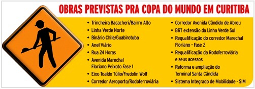 Enquanto segue a indefinição em relação ao início das obras da Arena da Baixada, a cidade de Curitiba já se movimenta para deixar tudo pronto para a Copa do Mundo de 2014. De acordo com a Secretaria Municipal de Obras Públicas, a capital está com o cronograma adiantado em comparação às outras cidades-sede.
