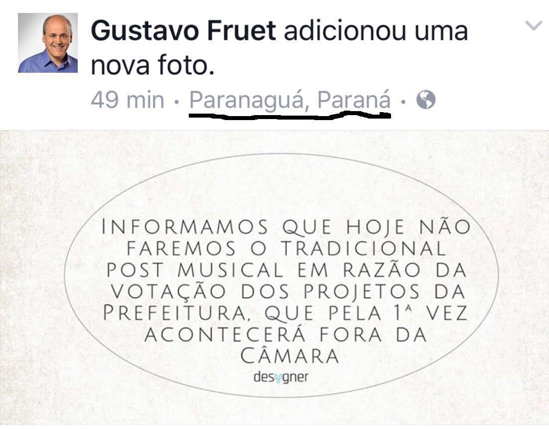 O ex-prefeito Gustavo Frfuet (PDT) tenta surfar na onda da oposição contra o pacote de ajuste da prefeitura em votação pelos vereadores. De Paranaguá, na primeira pessoa do plural, Fruet diz não fará post musical em razão da votação do ajuste “que 1ª vez acontecerá fora da Câmara”. “Até para apoiar os servidores, ele não está presente, fica fazendo post de Paranaguá”, reagiu um sindicalista do Simuc sobre o post assinado pela agência Desygner.