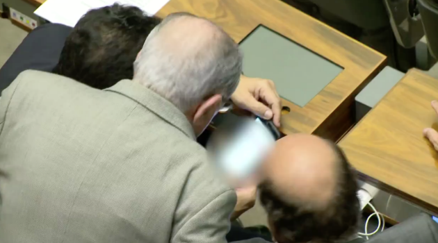 A cena foi registrada em vídeo pelo canal. Nas imagens, um deputado segura o celular embaixo da mesa, e outros aparecem para ver o conteúdo no aparelho.