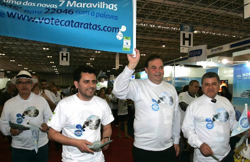 Munidos de faixas e bandeirinhas, representantes do Destino Iguaçu percorreram os cinco pavilhões do evento, distribuindo panfletos que pedem votos para eleger as Cataratas do Iguaçu uma das novas sete maravilhas da natureza.