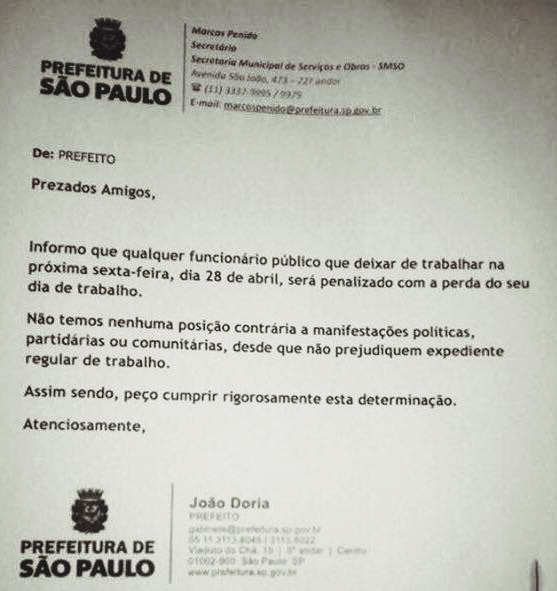 Em ofício, o prefeito de São Paulo, João Doria (PSDB) informou que serão penalizados com a perda do dia de trabalho os servidores que aderirem à greve marcada para esta sexta-feira, 28. “Não temos nenhuma posição contrária a manifestações políticas, partidárias ou comunitárias, desde que não prejudiquem expediente regular de trabalho”, destaca o memorando. Doria assina o documento ao alertar ainda: “Assim sendo, peço cumprir rigorosamente esta determinação”.