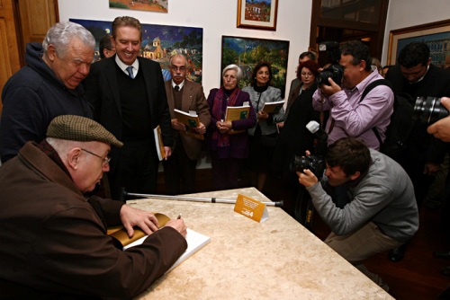 O prefeito de Curitiba, Luciano Ducci, e o ex-governador Jaime Lerner chamam atenção dos flashs dos fotógrafos e cinegrafistas durante o lançamento da quarta edição do livro Vozes do Paraná na noite desta terça-feira, 15, no Solar do Rosário. (foto Felipe Rosa).
