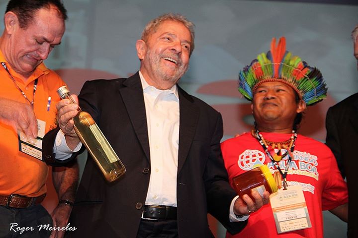 Em Foz do Iguaçu, o ex-presidente Lula palestrou no evento Cultivando Água Boa e o fotógrafo Roger Meireles tirou essa foto de Lula na maior alegria ao receber de presente um litro de pinga artesanal e um pote de mel.