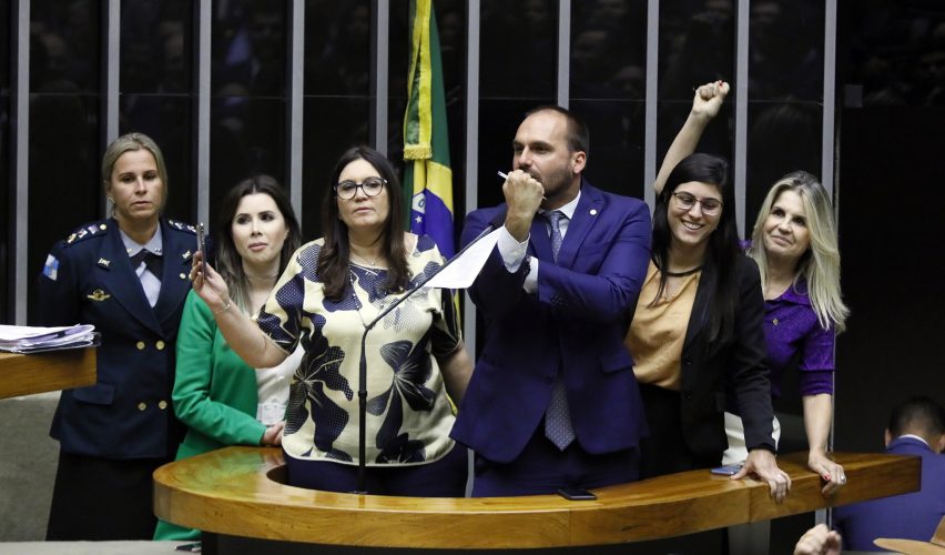 Após a líder do PSOL, Fernanda Melchiona (RS), ler uma nota de repúdio, em nome das mulheres da Câmara, às críticas do presidente Jair Bolsonaro ao trabalho da jornalista Patrícia Campos Mello, repórter do jornal Folha de S.Paulo, o deputado Eduardo Bolsonaro (PSL-SP), filho do presidente, subiu ao plenário e acirrou ainda mais os ânimos.”Esse tipo de discurso também revolta, a deputada diz que fala em nome das mulheres. Calma aí, será que não tem mulher aqui comigo não? Uma banana, em nome das mulheres. Uma banana! Quero saber onde elas estavam quando o Lula falou em mulheres de grelo duro. Onde vocês estavam? Estavam perdendo dinheiro enquanto isso, estavam roubando?” Enquanto Eduardo falava, acompanhado de homens e mulheres do PSL, começou um tumulto no plenário, com vaias de um lado e gritos de apoio ao deputado de outro. As informações são do Estadão.