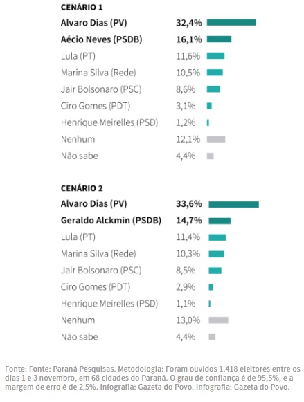 Foram ouvidos 1.418 eleitores entre os dias 1 e 3 novembro, em 68 cidades do Paraná. O grau de confiança é de 95,5%, e a margem de erro é de 2,5%.