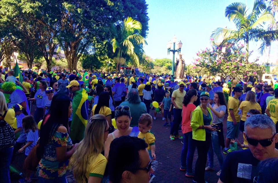 Mais de 10 mil pessoas protestaram contra a presidente Dilma Rousseff (PT) e o ex-presidente Lula (PT) na manhã deste domingo, 13, em Campo Mourão, no Noroeste do Estado. Os manifestantes se concentraram na frente da Igreja Matriz, cantaram o hino nacional e saíram em passeata pelas ruas centrais da cidade. Muitas faixas pediam também a cassação da prefeita Regina Dubay (PR), aliada da senadora Gleisi Hoffmann (PT).