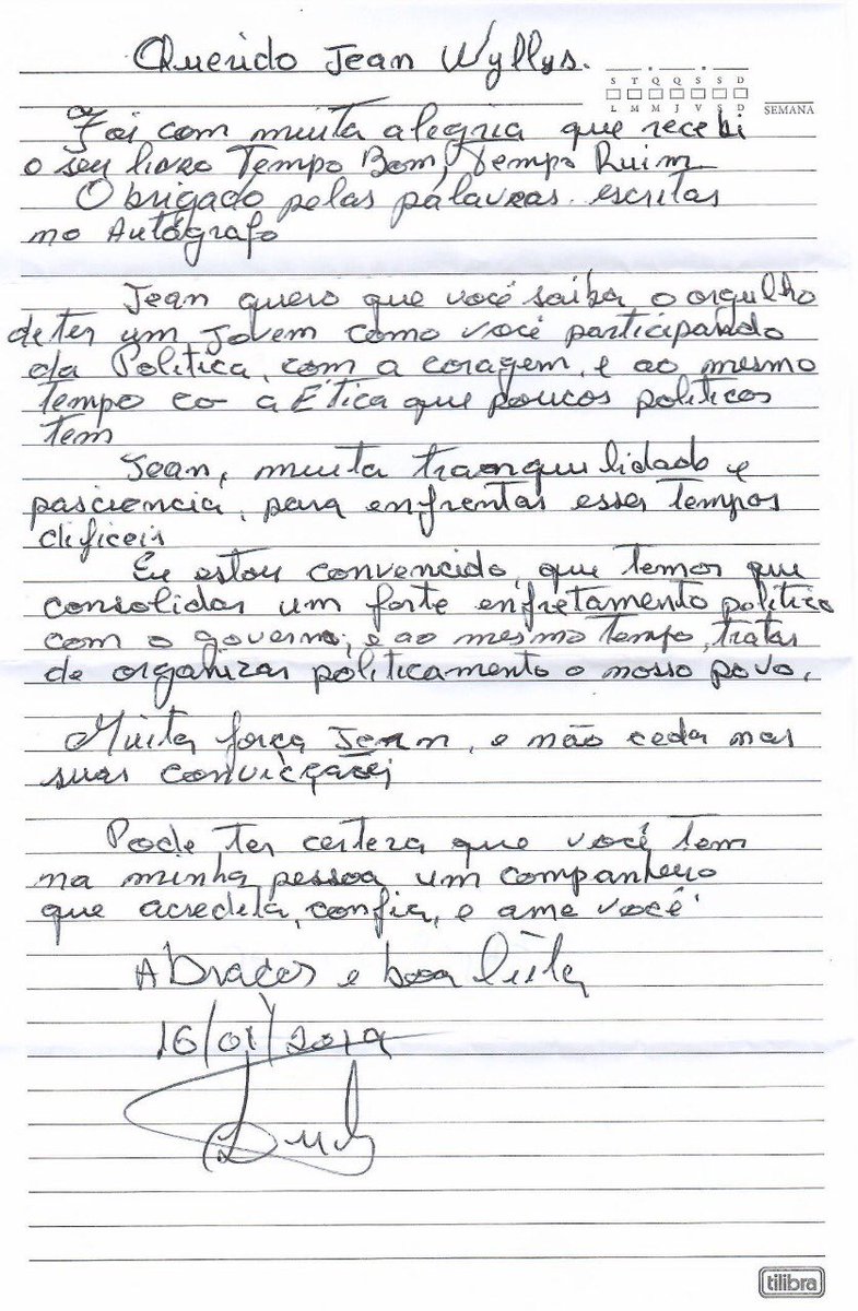 O deputado federal Jean Wyllys (Psol-RJ) escreveu ao ex-presidente Luiz Inácio Lula da Silva, em dedicatória num exemplar de seu livro “Tempo Bom, Tempo Ruim”, obra enviada para a cela dele na Superintendência Geral da Polícia Federal, em Curitiba. As informações são do 247.