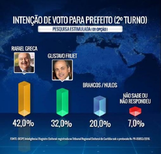 Em cenário de segundo turno com os líderes da primeira pesquisa Ibope, Rafael Greca (PMN) e Gustavo Fruet (PDT), Greca vence Fruet por 42% enquanto o pedetista tem 32%. Neste cenário, 20% dos eleitores curitibanos declaram a intenção de votar em branco ou nulo e 7% estão indecisos ou preferem não responder. A pesquisa foi divulgada nesta segunda-feira, 11, pelo Massa News.