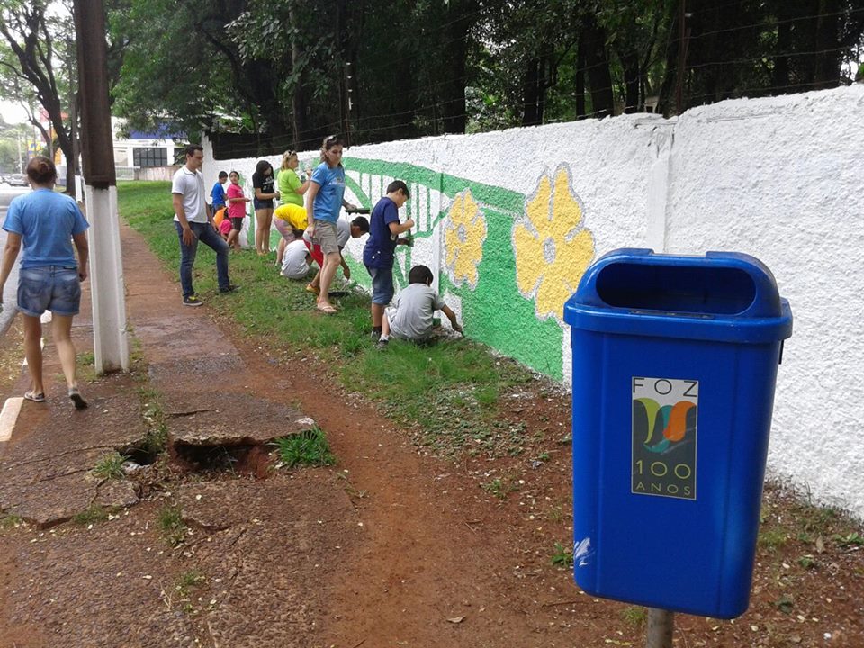 Após três dias de trabalho, os muros do Country Clube de Foz do Iguaçu estão encantando transeuntes e motoristas que circulam pela Avenida Paraná. Desde segunda-feira, alunos da APAE, Nosso Canto e da Rede Municipal de Ensino são os protagonistas da ação, sob a coordenação do Artista Plástico Adriano Monanc. Professores e funcionarias da Secretaria Municipal de Ensino, juntamente com a Secretaria Municipal de Obras (idealizadora do projeto) auxiliam o artista na execução.