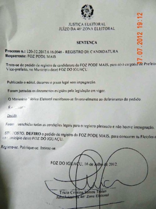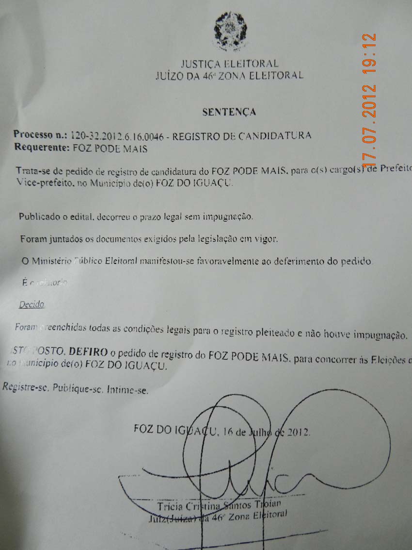 “Foram preenchidas todas as condições legais para o registro pleiteado e não houve impugnação. Isto posto, defiro o pedido de registro do ‘Foz Pode Mais’, para concorrer às eleições do município de Foz do Iguaçu”, anotou a magistrada, no processo número 120-32.2012.6.16.0046.