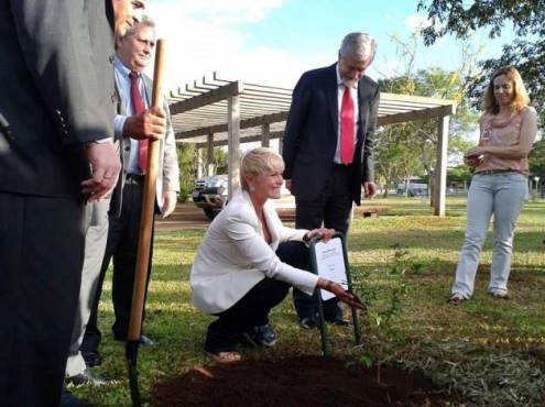 Em Foz do Iguaçu, Xuxa planta árvore no Bosque de Itaipu, sob o olhar de Samek