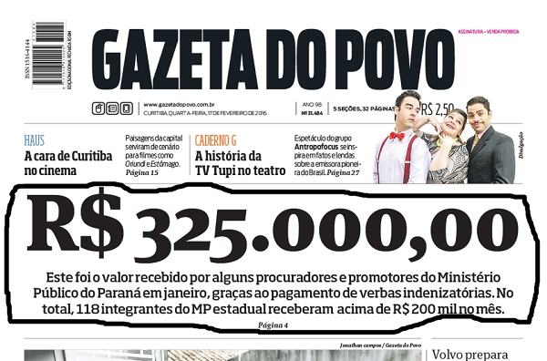 A Associação dos Magistrados Paranaenses (Amapar) e a Associação Paranaense do Ministério Público (APMP) conseguiram publicar, na edição desta quinta-feira (25) da Gazeta do Povo, um “direito de resposta” (leia aqui) relativo às reportagens “TJ e MP pagam supersalários que superam em 20% o teto previsto em lei” (veja aqui) e “Em dezembro de 2015, salário médio de magistrados foi de R$ 103,6 mil” (matéria completa), ambas de 15 de fevereiro, entre outras correlatas. Na nota que, como raramente se vê, ocupa toda a página 4, a mais nobre do jornal, as entidades alegam ter havido “atuação excessiva” por parte dos autores das matérias, “ao arrepio da lei”.