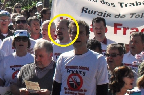 O presidente da Câmara de Vereadores de Toledo, Adriano Remonti (PT), liderou ontem (terça-feira, 3) um protesto contra a Petrobras na cidade do Oeste do Paraná. O protesto foi organizado para combater a exploração de gás de xisto na região, uma concessão vencida pela Petrobras em leilão do governo federal no ano passado. A Petrobras arrematou 49 lotes no leilão, sete deles no Paraná e um na região de Toledo. O petista Adriano Remonti, na foto com o círculo amarelo, foi um dos líderes da manifestação, que reuniu cerca de 500 pessoas, com o lema Movimento contra o Fracking – Diga não à exploração do gás de xisto no Paraná.