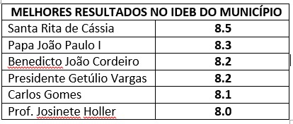 As escolas com melhor pontuação em Foz do Iguaçu foram: 1º Santa Rita de Cássia – 8.5; 2º Papa João Paulo I – 8.3; 3º Benedicto João Cordeiro – 8.2; 4º Presidente Getúlio Vargas – 8.2; 5º Carlos Gomes – 8.1; 6º Prof. Josinete Holler – 8.0.