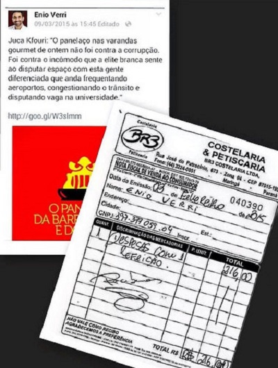 Em seu perfil no Facebook, na segunda, 9, o deputado federal Enio Verri, presidente do PT paranaense, reproduziu Juca Kfouri, que por sua vez é muito ligado a FHC: “O panelaço nas varandas gourmet de ontem não foi contra a corrupção. Foi contra o incômodo que a elite branca sente ao disputar espaço com esta gente diferenciada que anda frequentando aeroportos, congestionando o trânsito e disputando vaga na universidade”.