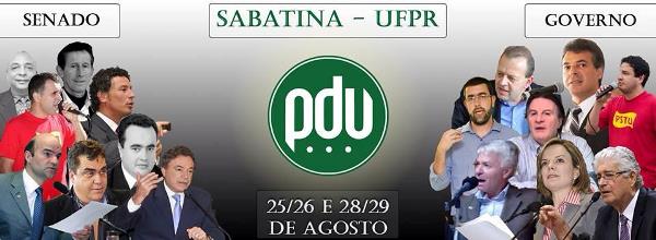 “O Partido Democrático Universitário (PDU) convida toda a comunidade acadêmica para participar de nossa série de sabatinas com os candidatos a Senador da República e Governador do Estado do Paraná. O evento ocorrerá no Salão Nobre da Faculdade de Direito, nos dias 25 (segunda), 26 (terça), 28 (quinta) e 29 (sexta) de agosto, a partir das 18h00. Na terça-feira, dia 26, o encontro com os candidatos também ocorrerá pela manhã, a partir das 9h00.