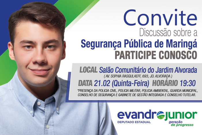 O deputado estadual Evandro Júnior (PSDB) convida a população de Maringá para um debate sobre a segurança pública na cidade. Participarão do evento representantes das polícias militar, civil e ambiental, da guarda municipal, conselho de segurança, gabinete de gestão integrada o do conselho tutelar.