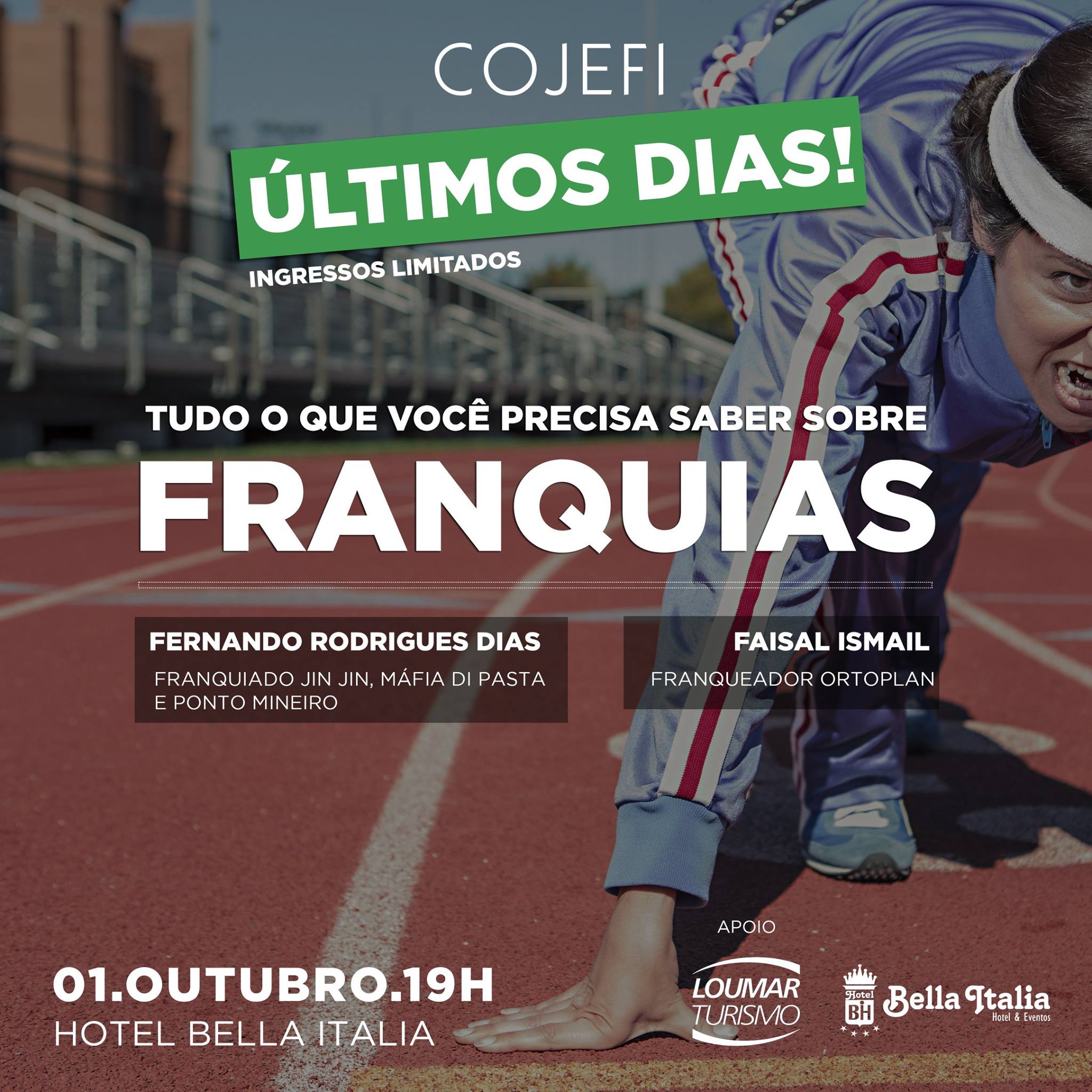 Você sabe como funcionam e o que são as franquias? Para esclarecer estas e outras dúvidas, o Cojefi apresenta quinta-feira (1º de outubro) o “Tudo o que você precisa saber sobre franquias”. Um bate-papo com dois nomes importantes quando o assunto é franchising na região: Fernando Rodrigues Dias – franquiado Jin Jin, Máfia de Pasta e Ponto Mineiro – e Faisal Ismail – Franqueador Ortoplan.