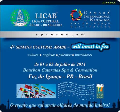 O município de Foz do Iguaçu se movimenta para receber um grande evento do business world (mundo dos negócios), no ano em que completa 100 anos de emancipação. O Will invest in foz 2014, ou seja, “Venha investir em Foz”, acontece simultaneamente com a 4ª Semana Cultural Árabe, de 1º 05 de julho de 2014, no Bourbon Cataratas Spa & Convention. Durante o evento, os organizadores entregarão comendas do centenário iguaçuense aos participantes.