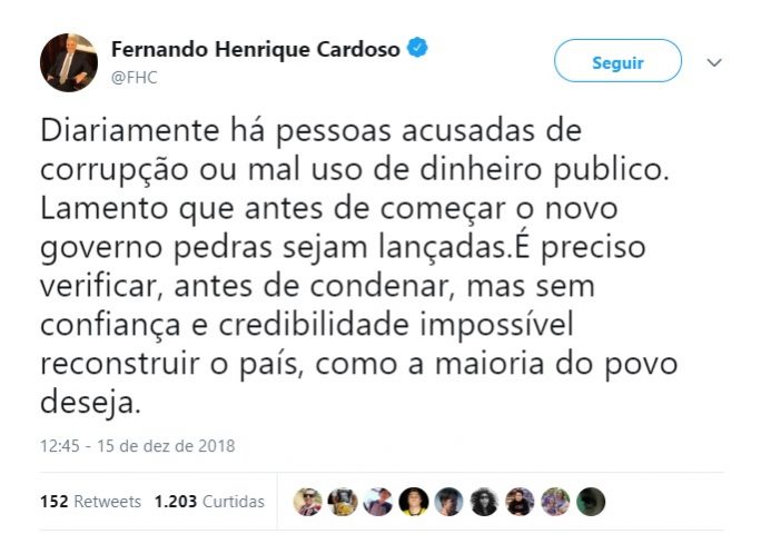 O ex-presidente Fernando Henrique Cardoso (FHC) lamentou neste sábado (15), em seu perfil do Twitter, que pedras sejam lançadas “antes de começar o novo governo”, em alusão as últimas notícias sobre movimentações na conta de Fabrício José Carlos de Queiroz, ex-assessor parlamentar do senador eleito Flávio Bolsonaro (PSL-RJ). As informações são do Diário do Poder.